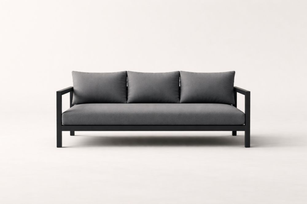 Divano a tre posti in metallo con cuscini in tessuto grigio