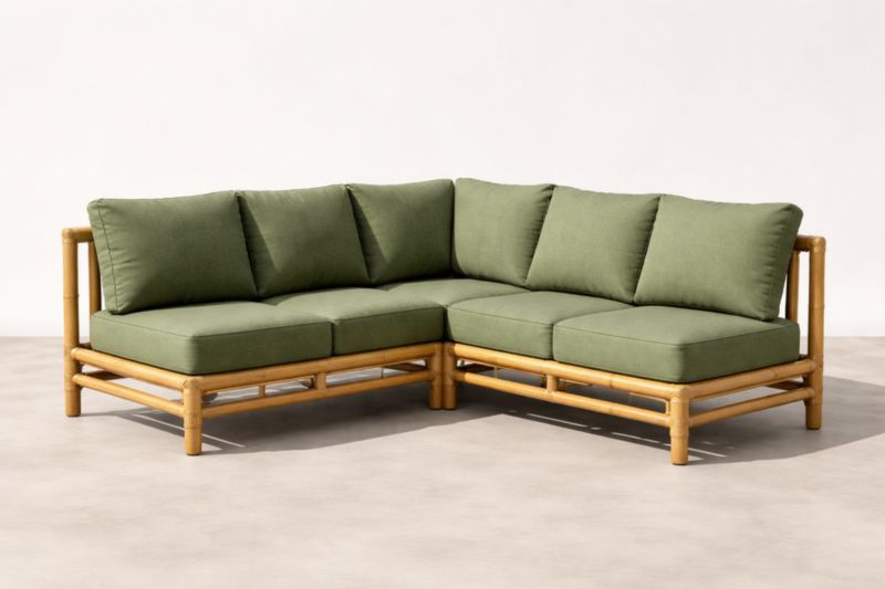 Base in bambù con cuscini in tessuto di poliestere. Adatto per uso interno ed esterno. Dimensioni totali: 200 cm x 200 cm x 80 cm. Spessore del cuscino: 10 cm. Peso totale: 15 kg.